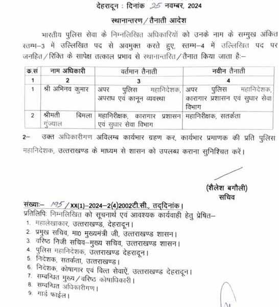 इसके अलावा कारागार प्रशासन देख रहीं आईजी विमला गुंज्याल को सतर्कता विभाग सौंपा गया है।