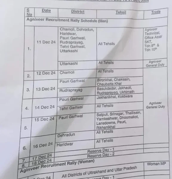 मेजर मेहता ने बताया कि 11 दिसम्बर को पुरूष अग्निवीर भर्ती टैक्नीकल, ऑफिस अस्टिेंट/एसकेटी ट्रेड में जनपद चमोली, देहरादून, हरिद्वार, पौड़ी गढ़वाल, रूद्रप्रयाग, टिहरी गढ़वाल व उत्तरकाशी की भर्ती की जाएगी। जबकि उत्तरकाशी जनपद की 11 दिसम्बर को अग्निवीर जनरल ड्यूटी भर्ती रैली आयोजित की जाएगी। वहीं 12 दिसम्बर को चमोली, 13 को पौड़ी गढ़वाल व रूद्रप्रयाग, 14 को पौड़ी गढ़वाल व टिहरी गढ़वाल, 15 दिसम्बर को पौड़ी गढ़वाल, 16 दिसम्बर को देहरादून व हरिद्वार जनपद की अग्निवीर भर्ती रैली आयोजित की जाएगी। साथ ही 17 व 18 दिसम्बर को आरक्षित दिवस रखे गये हैं।